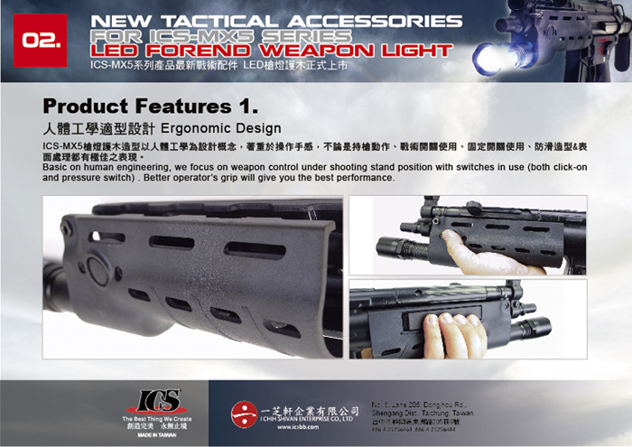在週三ICS靜靜地發布了他們MX5專用的LED Forend Weaponligh,配備了200流明,在hanguard有開關雙方CQB時又一好幫手!而電LED Forend Weaponligh跟hanguard是一套的,hanguard是由 Polymer所製造,能好好保持電池和手之間的溫度,手感也非常好!